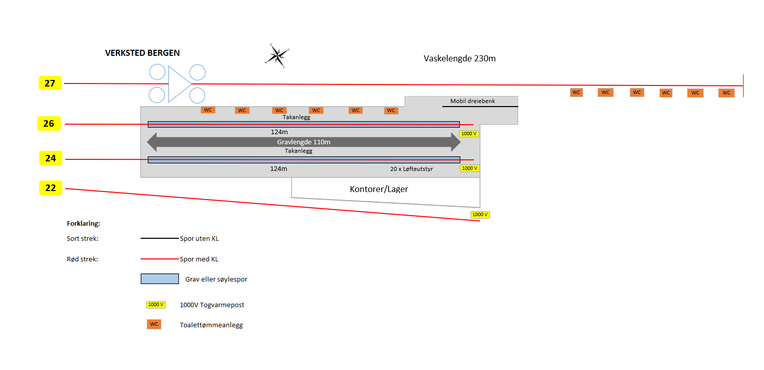 | Bygning | Spor nummer | Total sporlengde (m) | KL-anlegg | Gravlengde (m) | Løfteanlegg | Tilgang til takkontroll | Travers-kran | Tine/tørke | Toalettømme-anlegg | Vann-fylling | Togvarme | Tog-vaskemaskin | Kadaver-sanering | Togvekt | Medie-anlegg | Hjul-dreiing | Lakkerings-anlegg | Trykkluft | Merknader |