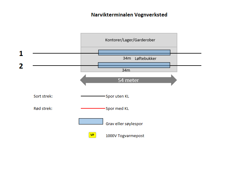 Bygning Spor nr. Total sporlengde (m) KL-anlegg Gravlengde (m) Løfte-anlegg Tilgang til takkontroll Travers-kran Tine/tørke Toalettømme-anlegg Vann-påfylling 400 V prøvestrøm 1000 V togvarme Tog-vaskemaskin Kadaver-sanering Togvekt Medie-anlegg Hjul-dreiebenk Lakkerings-anlegg Merknader