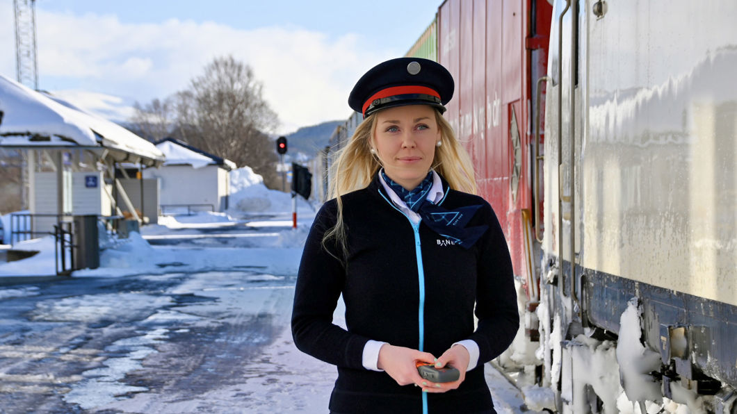 Bilde av ei kvinne i trafikkstyraruniform ved eit tog.