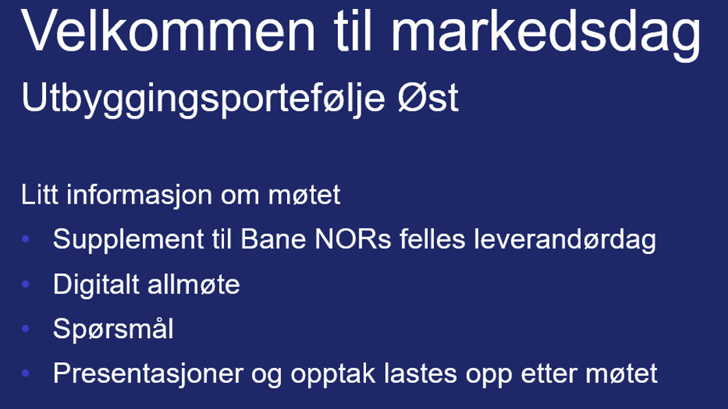 Utbyggingsportefølje Øst i Bane NOR arrangerte en markedsdag for leverandører 4. september 2024. På denne siden kan du se et opptak av møtet, og laste ned presentasjonen som ble vist.