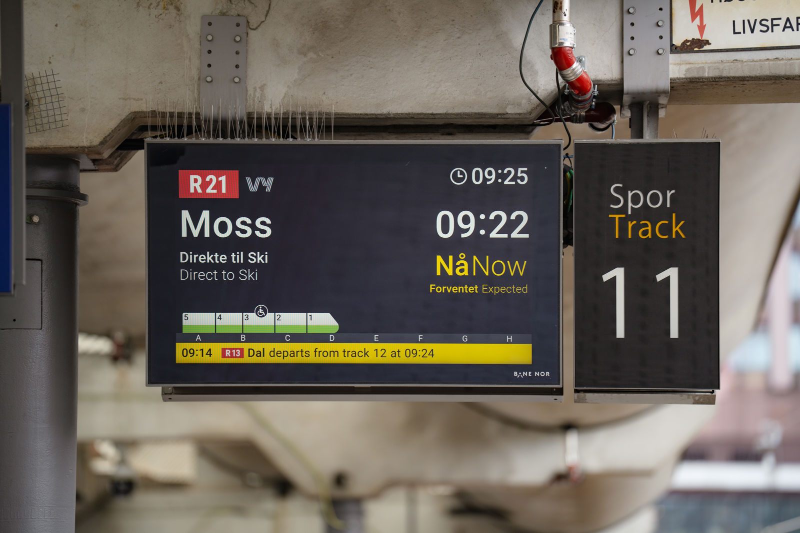 Skjermene viser avgangstid, hvilket tog som kan ventes på plattformen og annen nyttig informasjon. Du kan se hvor mange vogner toget har, vognnummer, servicetilbud og hvor i toget det er best plass.