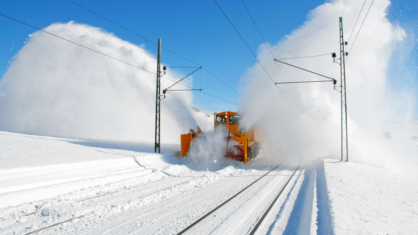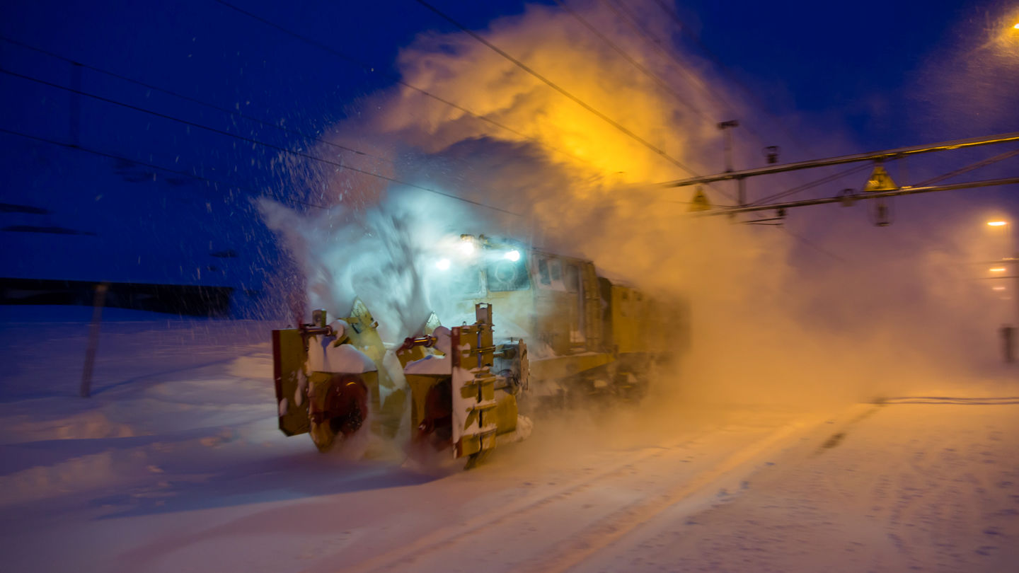 Storm, ras, og tunge snøfall stiller tøffe krav til vinterdrift på jernbanen. Døgnet rundt er me klare til å rykkja ut for å rydda snø og is.