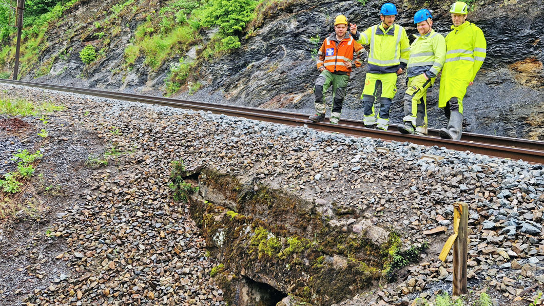 Stein, grus og kvister graves ut av gamle dreneringsrør. Nye vannveier støpes, så regnet kan renne fritt. Stadig større deler av jernbanen blir sikret mot oversvømmelser og ras.