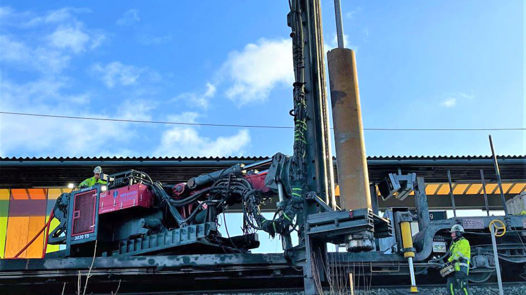 Nå er det første fundamentet for feste av kontaktledningsmast boret på Marienborg stasjon. Dette markerer de første synlige tegnene på at det nå kommer grønne spor i Trøndelag.