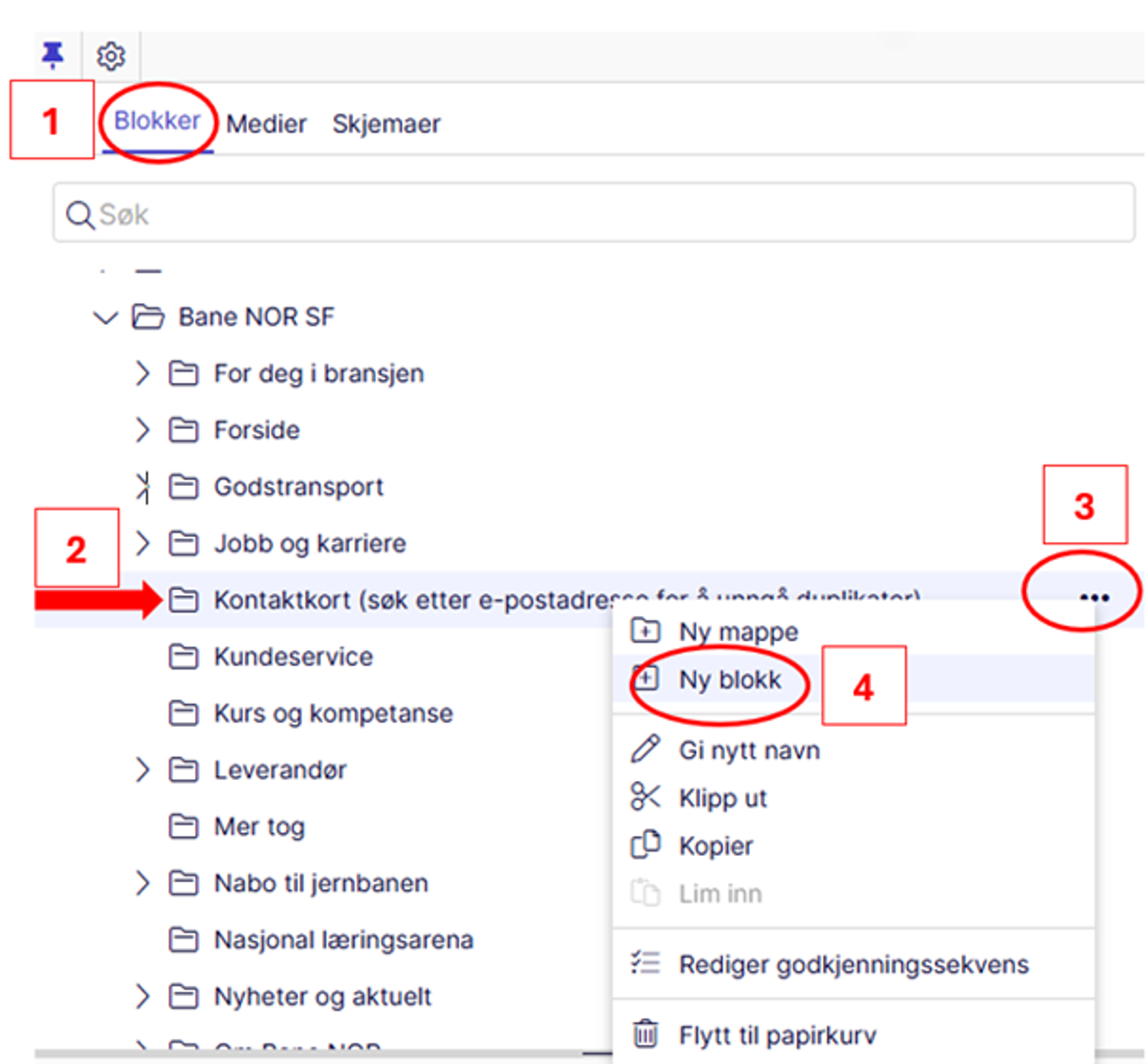 1) Marker "Blokker". 2) Marker mappen "Kontaktkort". 3) Klikk på de tre prikkene så menyen blir synlig. 4) Velg "Ny blokk".