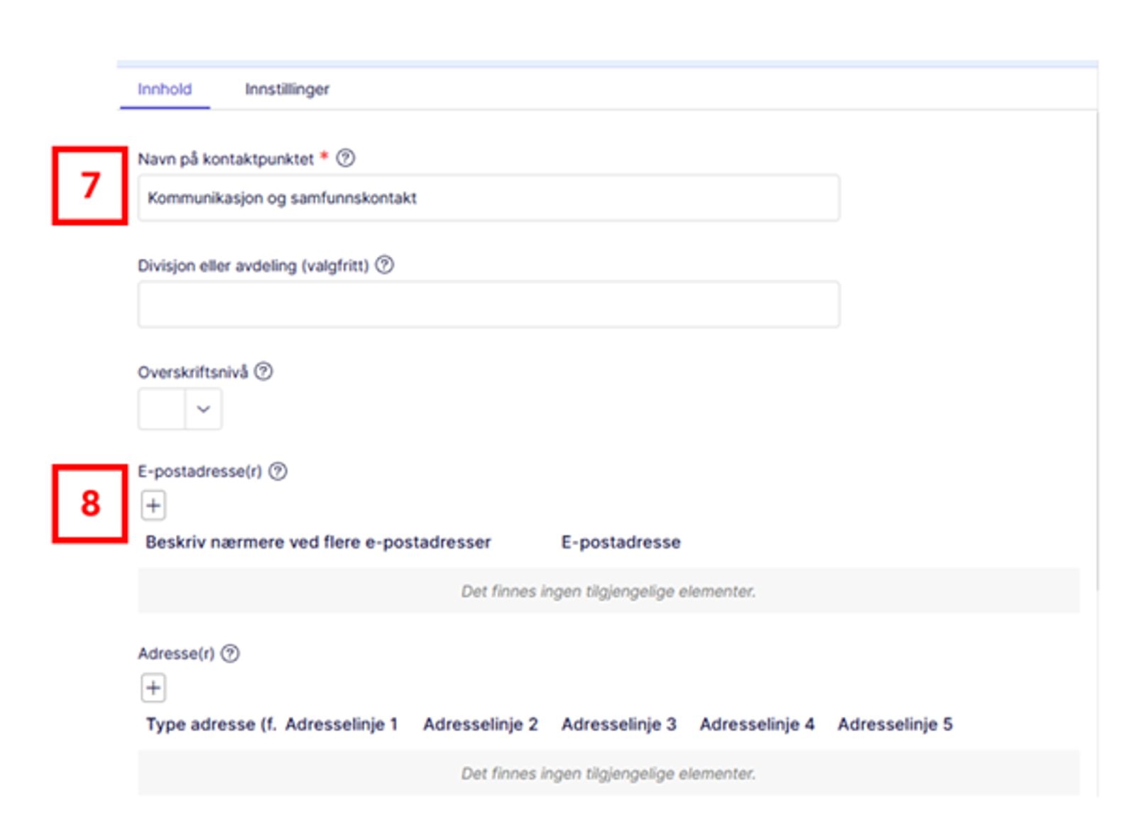 Blokken for kontaktpunkt brukes for å presentere hvilken enhet eller felles e-postadresse brukerne kan kontakte for å få mer informasjon.