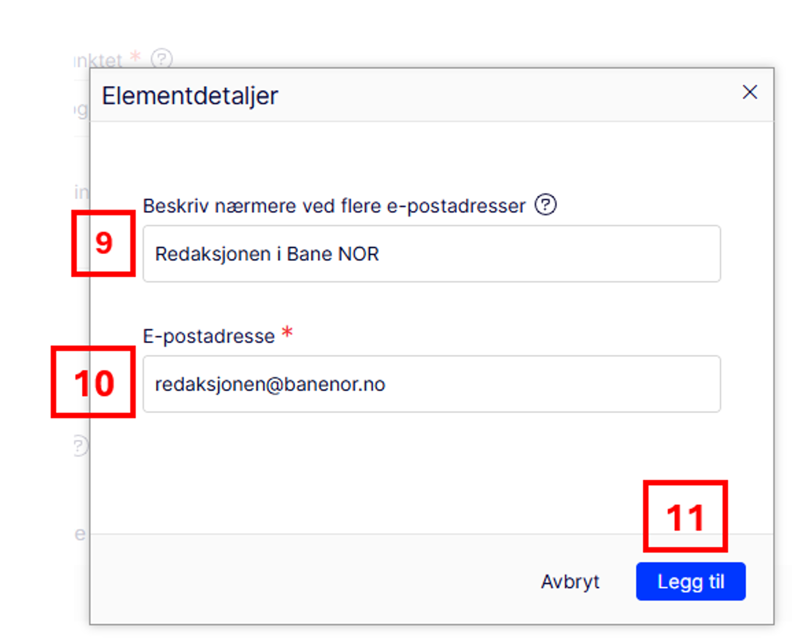 9) Beskriv hvem e-posten blir sendt til. 10) Fyll inn e-postadressen. 11) Klikk på "Legg til".