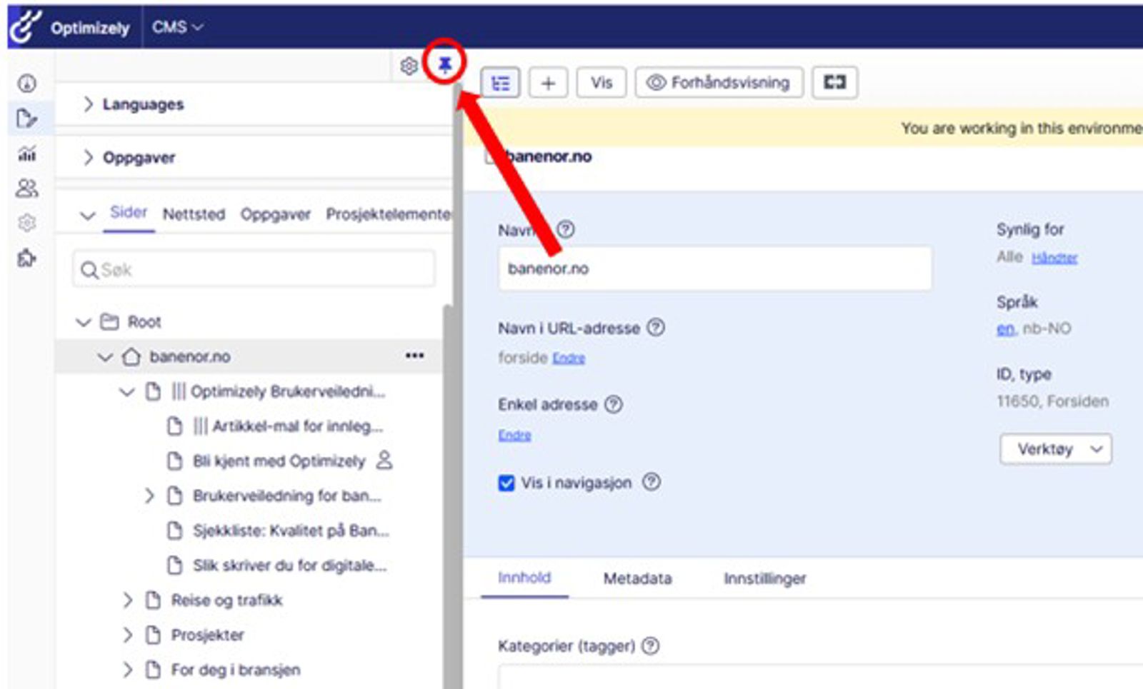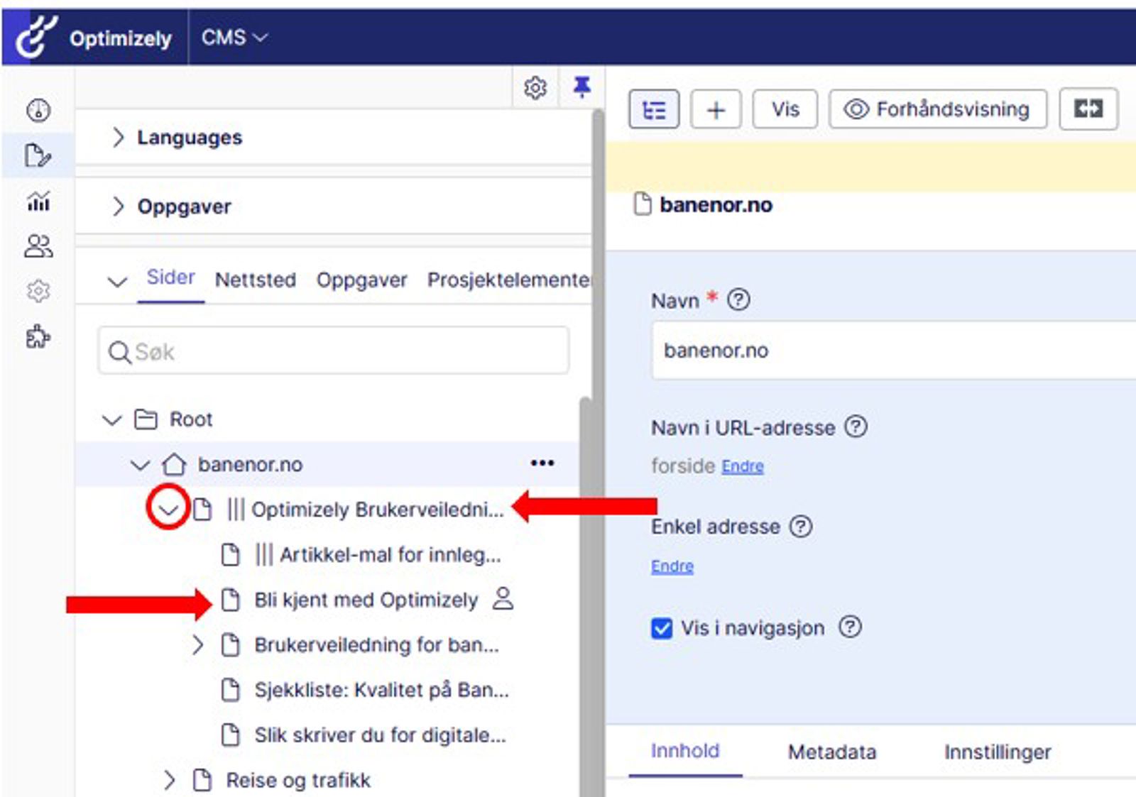 For eksempel, hvis vi skulle redigert denne siden (https://www.banenor.no/optimizely-brukerveiledning/bli-kjent-med-optimizely/) må vi først åpne "Optimizely Brukerveiledning", så trykker du på siden "Bli kjent med Optimizely" i navigasjonen slik: