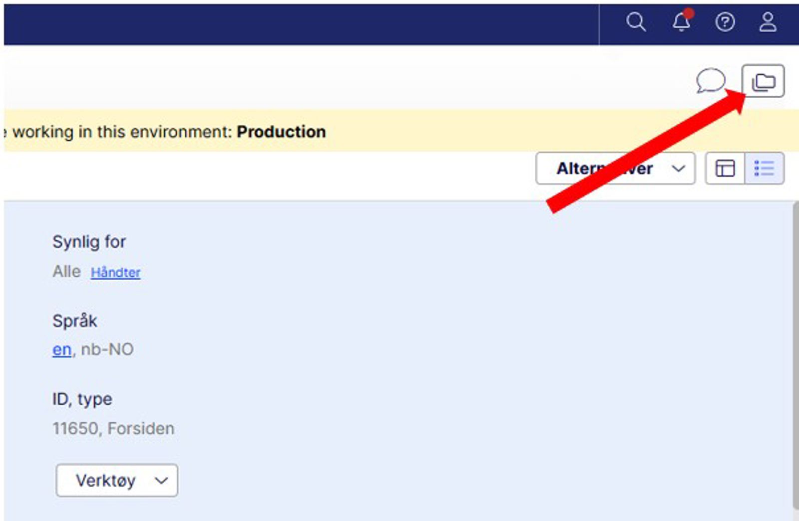 - Rødt klokke-ikon, som betyr at siden er avpublisert og ikke lenger er synlig for publikum.