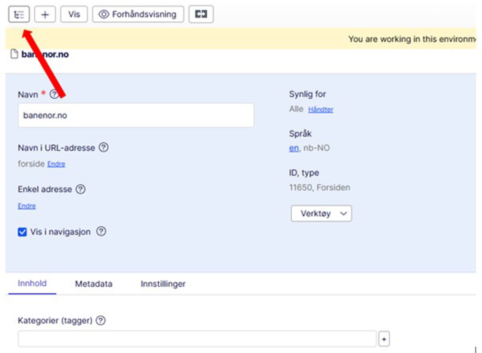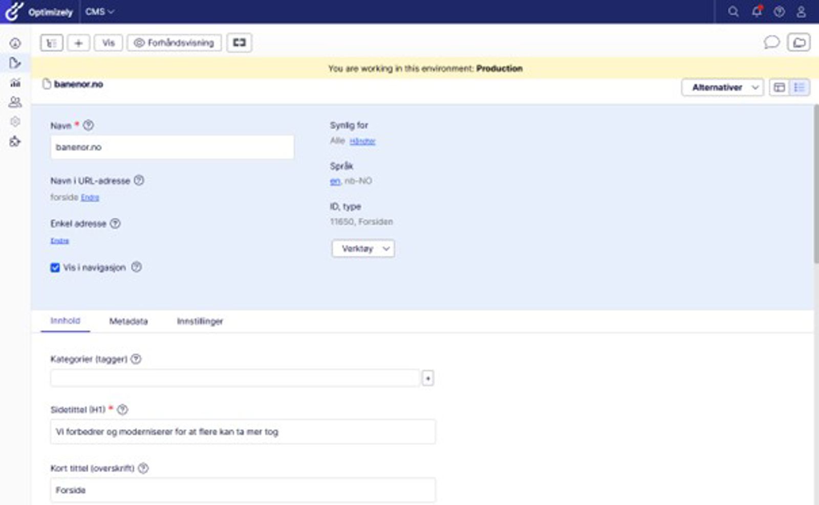 Første gang du kommer inn i Optimizely ser du forsiden på banenor.no i redigeringsmodus og veldig lite annet. Det kan for eksempel se slik ut: