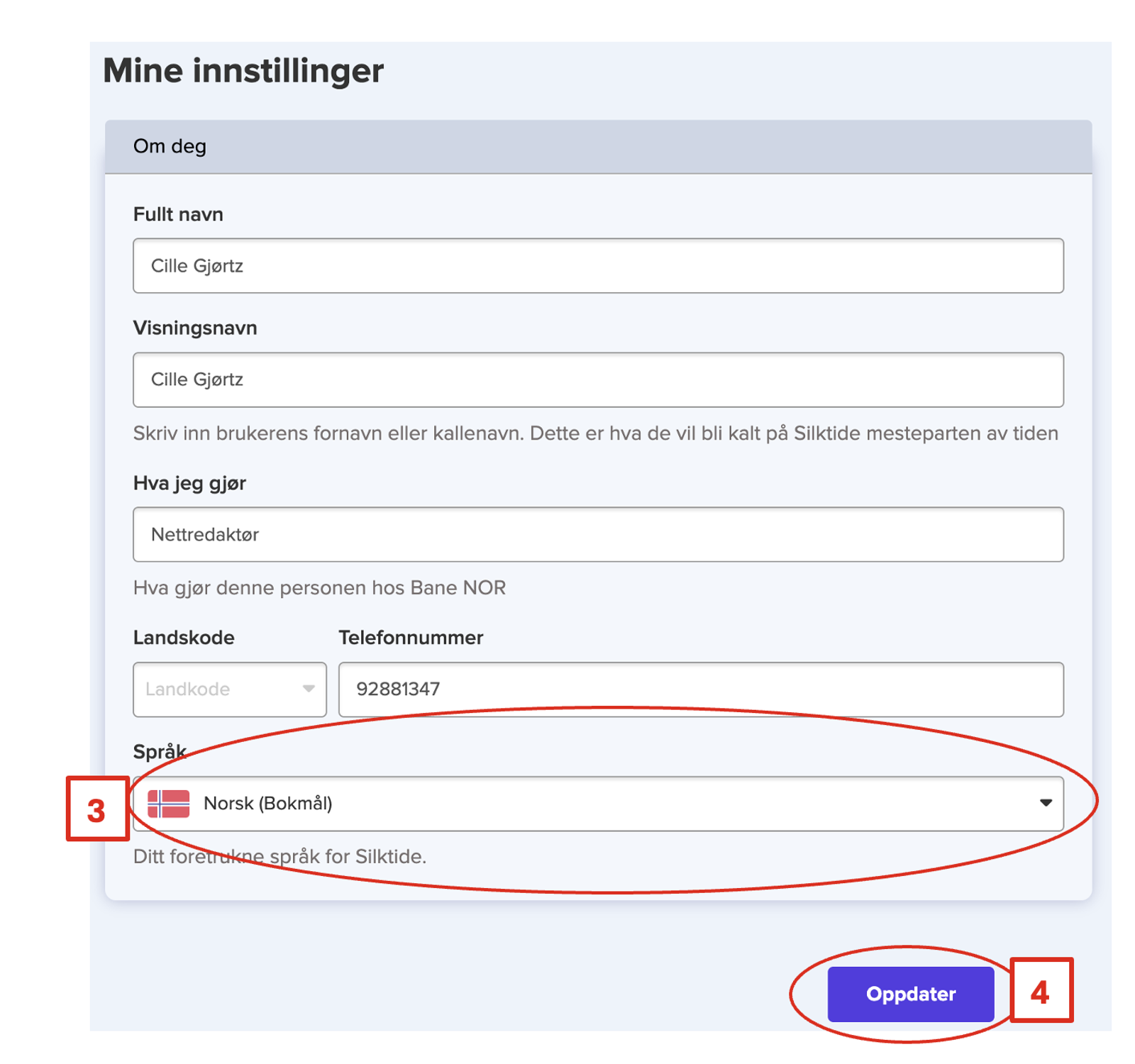 Nederst i dette bildet, velger du Norsk Bokmål fra nedtrekksmenyen, og klikker på Oppdater.