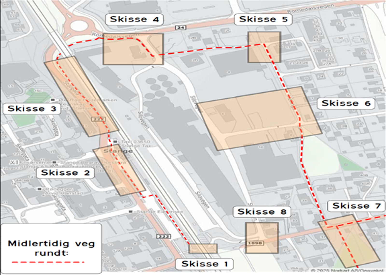 Ettersom Østre Volla også er stengt tidligere i år, vil det i denne perioden være en trygg og tydelig merket gangtrasé via Stange bru, med universell utforming og god belysning.