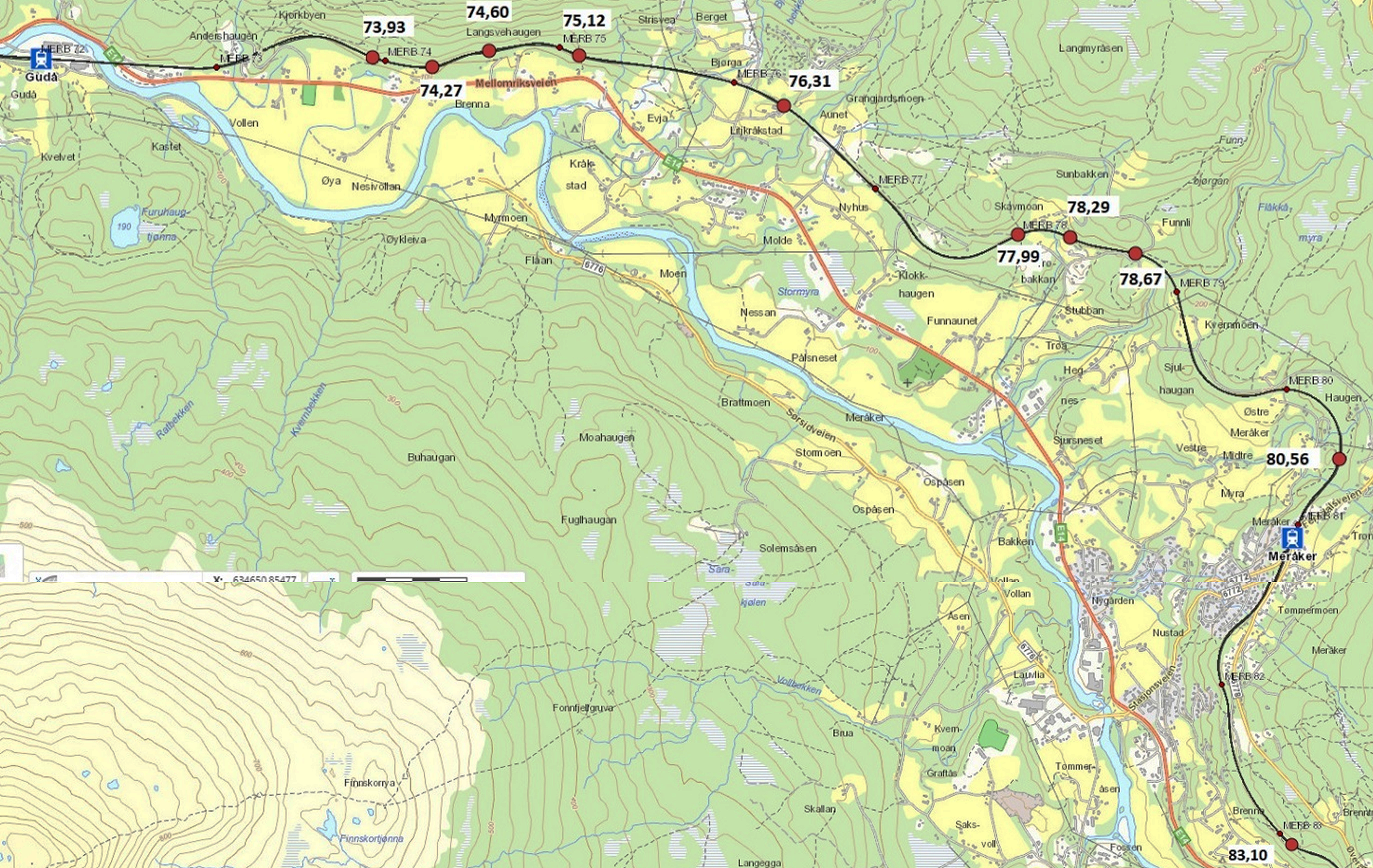 Overgangsbru rett øst for Meråker stasjon, vises i kartet på km 80,56