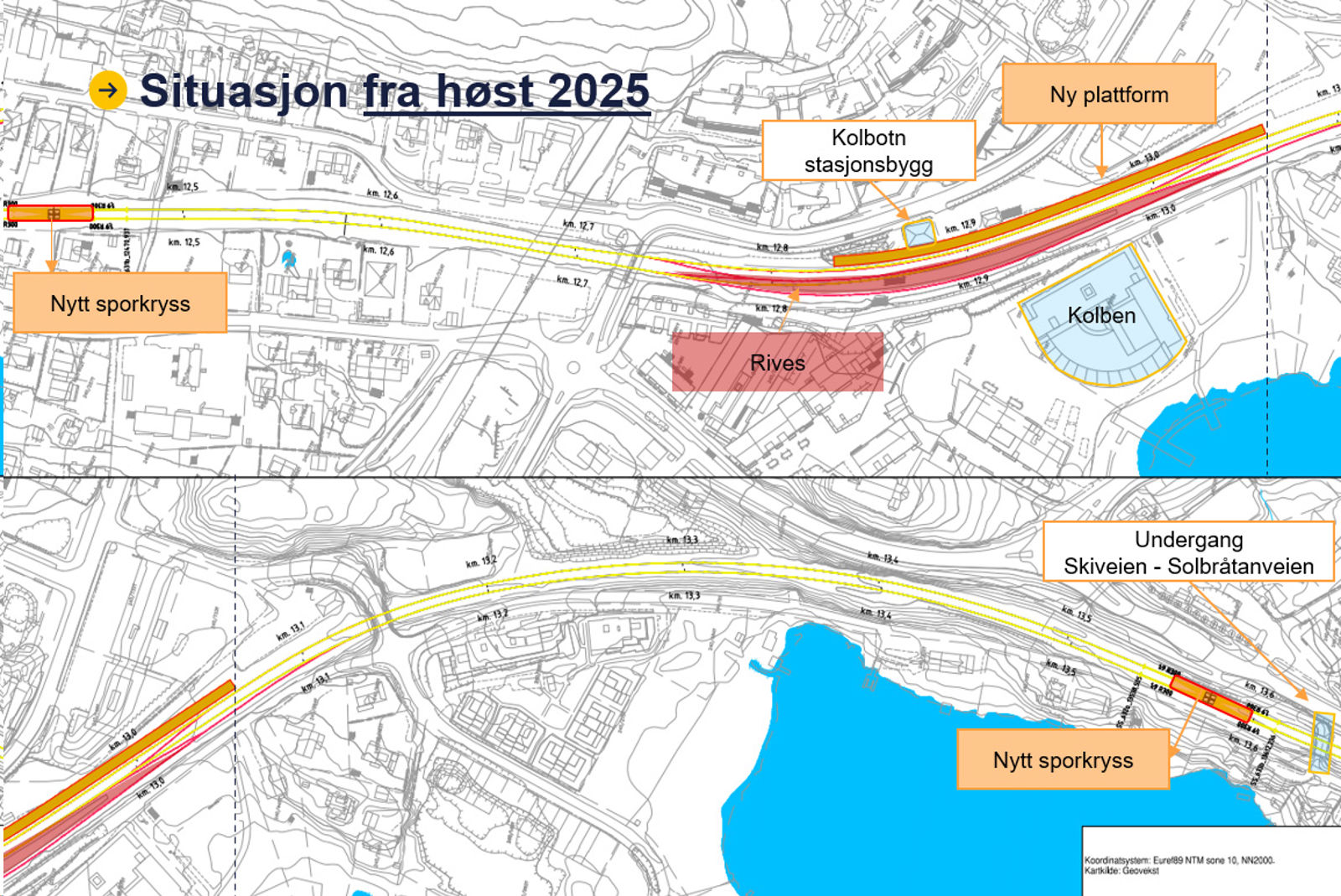 De viktigste oppgavene i 2025 blir å bygge ny plattform på stasjonssiden, rive dagens midtplattform og installere nye sporkryss. Men det skal også utføres mange andre arbeider, blant annet å etablere fundamenter for nye master for kjørestrømmen. Disse arbeidene har planlagt oppstart våren 2025.