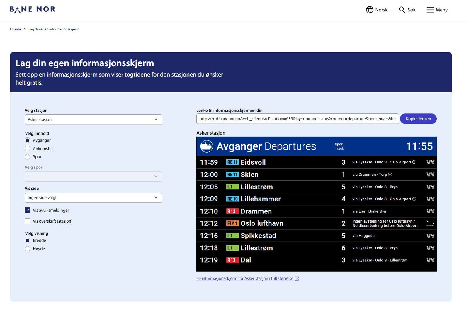 Løsningen er enkel og brukervennlig. Gå til siden Lag din egen informasjonsskjerm og velg ønsket stasjon og type visning. Du kan velge avganger, ankomster eller skjermene som er ved de ulike sporene på en stasjon. Du kan også velge om du ønsker å vise informasjons– og avviksmeldingene nederst på skjermen.