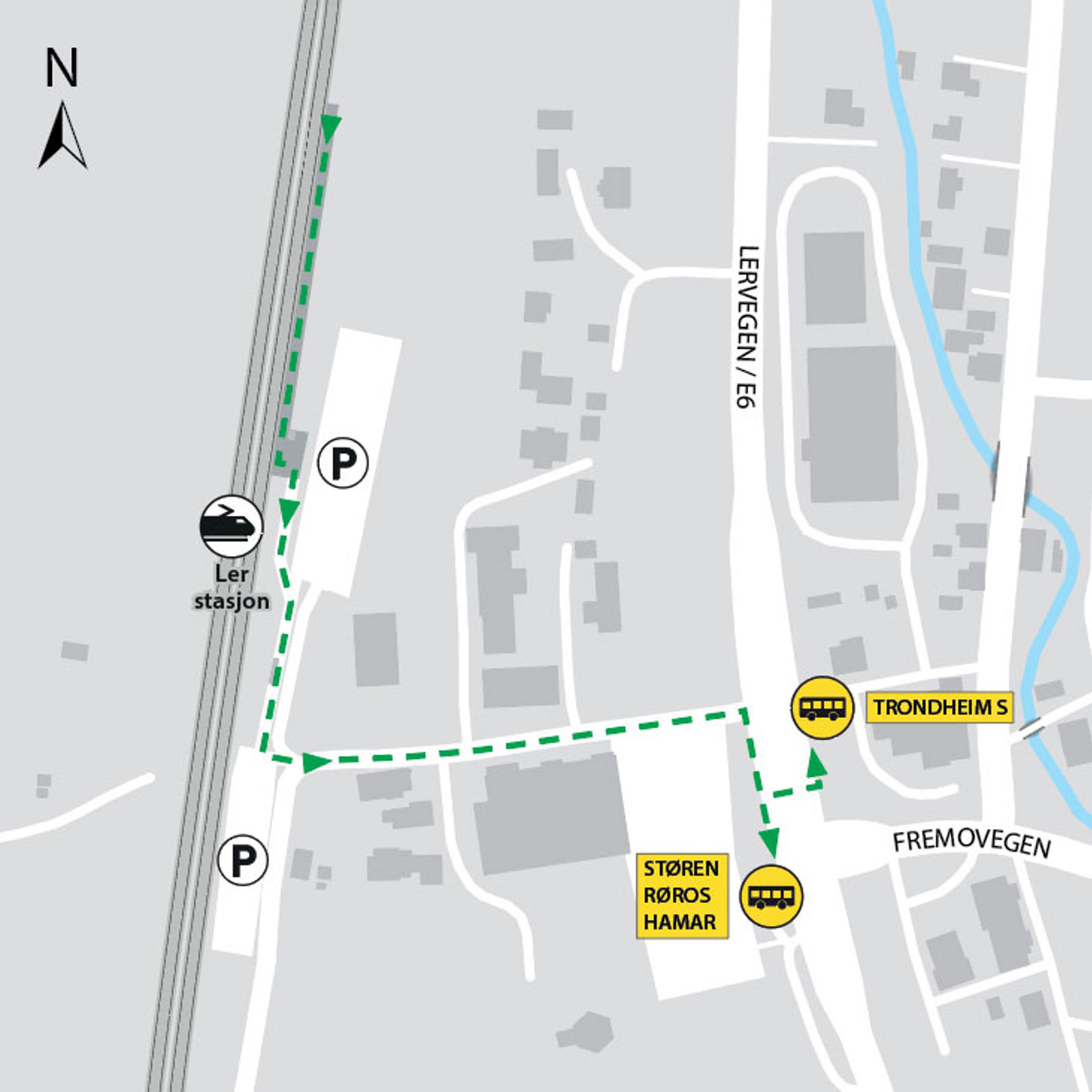 Bussene kjører fra bussholdeplassene Ler. Gangavstand til holdeplassene er ca. 300 meter.