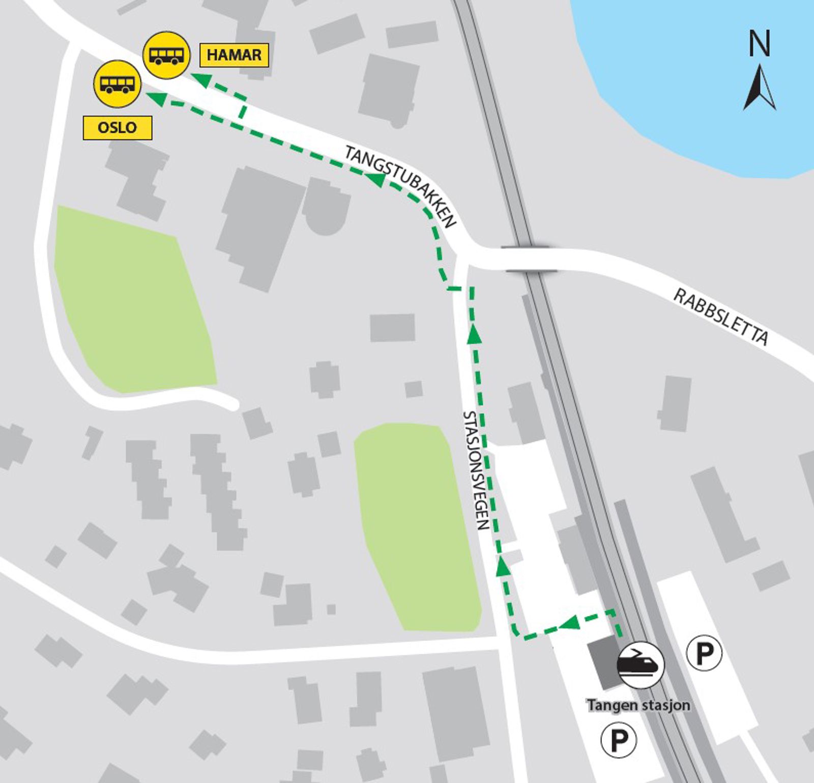 Tangen stasjon i Stange ligger på Dovrebanen. Herfra kan du ta toget mot Lillehammer, Oslo S og Drammen.